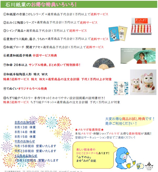 和紙屋の手しごと、和紙屋のちりめん細工、美濃和紙の産地で和雑貨を一つひとつ手作りしている石川紙業をどうかよろしくお願いします。当社のあったかい雰囲気や商品が、お客様の笑顔をつくり、幸せや元気をプレゼントできることを心から願っています。