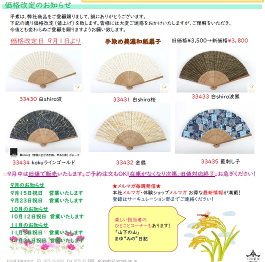 ■価格改定連絡!9/1より価格改定!対象品:手染め美濃和紙扇子