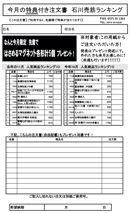 ~今月の注文書利用プレゼントはランキング用紙をご確認下さい~