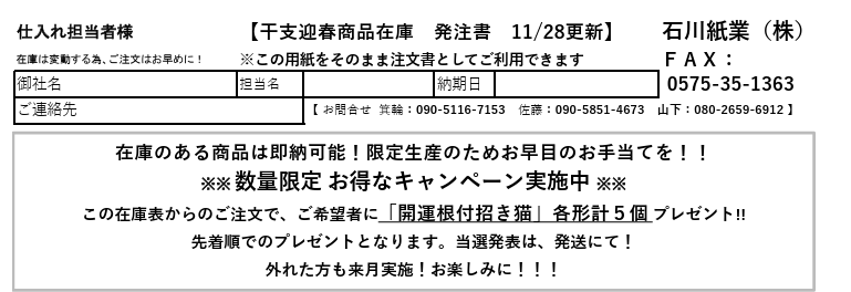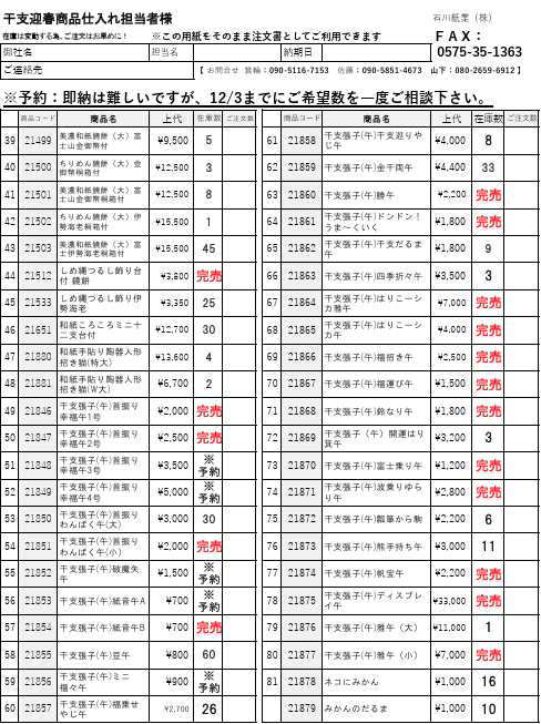 【即納可能な干支迎春商品在庫表のご案内です。】