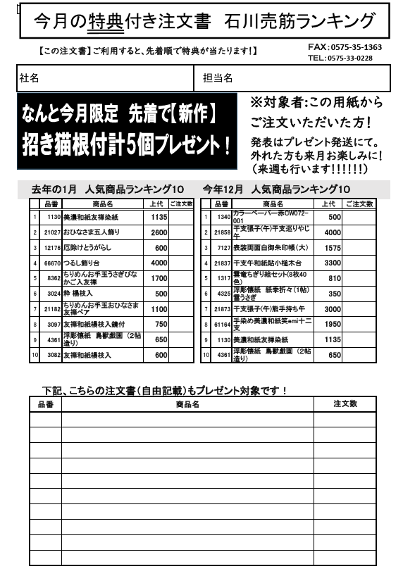 ~今月の注文書利用プレゼントはランキング用紙をご確認下さい~