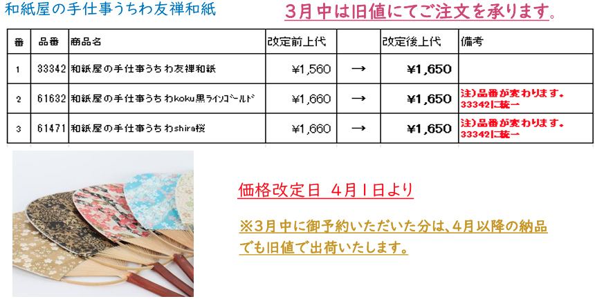 4/1より価格改定します商品を3月いっぱい旧値でご対応!
