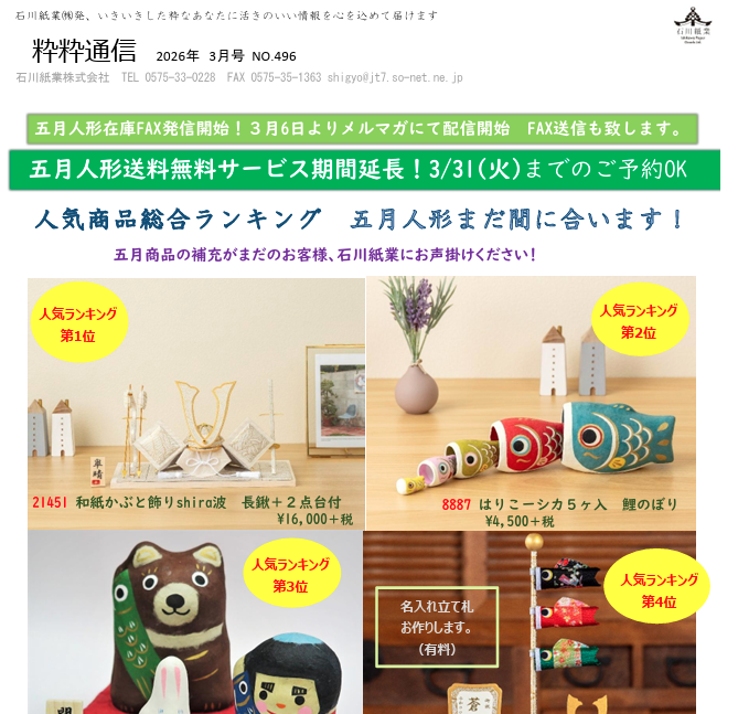 在庫表送信予定:五月人形は3/6よりメール配信!