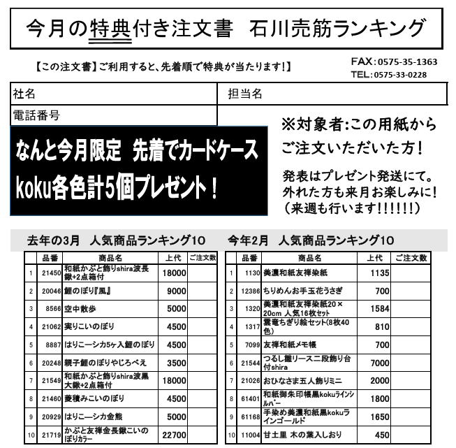 ~今月の注文書利用プレゼントはランキング用紙をご確認下さい~