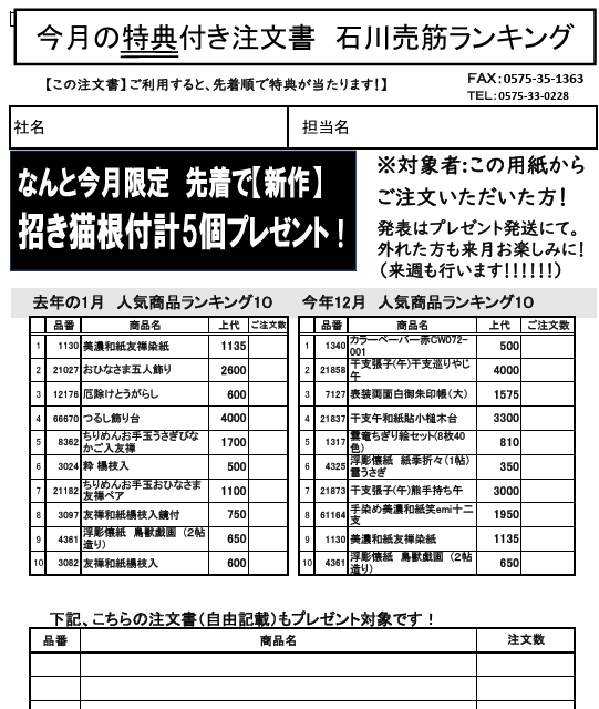 ~今月の注文書利用プレゼントはランキング用紙をご確認下さい~